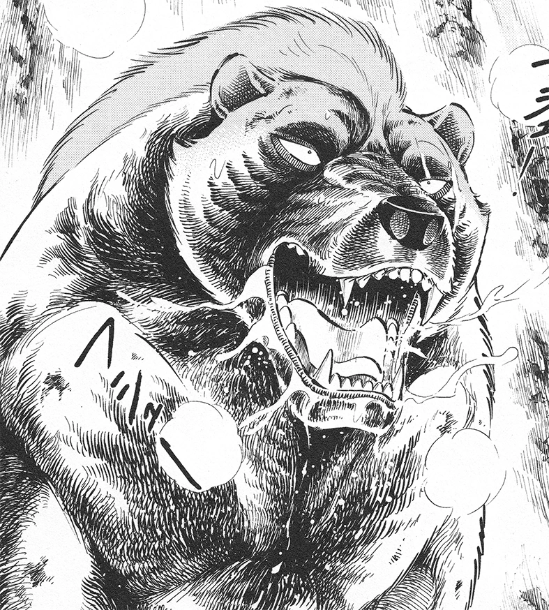 Monsoon gives Bob more orders, but is once again shouted at by Zion. In anger, Monsoon pounces towards the dogs when they are distracted by the death of Kenshin. He slams his paw down on Unsai, but misses as the dog went between his fingers instead. In a brief moment, Unsai and the others quickly flee, aside from Sirius who talks to Bob with Zion. Monsoon looks at Sirius, and remembers how a young Gin attacked John who killed bear cubs. Monsoon swipes his kin away from the dogs when they try to attack, and allows them to take the bodies of Fuyuki and Hiromitsu away, not attacking them as they go. Confused and angered by his own actions, Monsoon roars loudly.