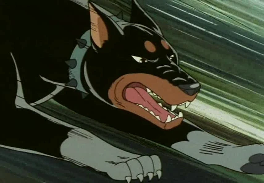 Sniper is a black Doberman with brown eyes and red collar (in the manga).